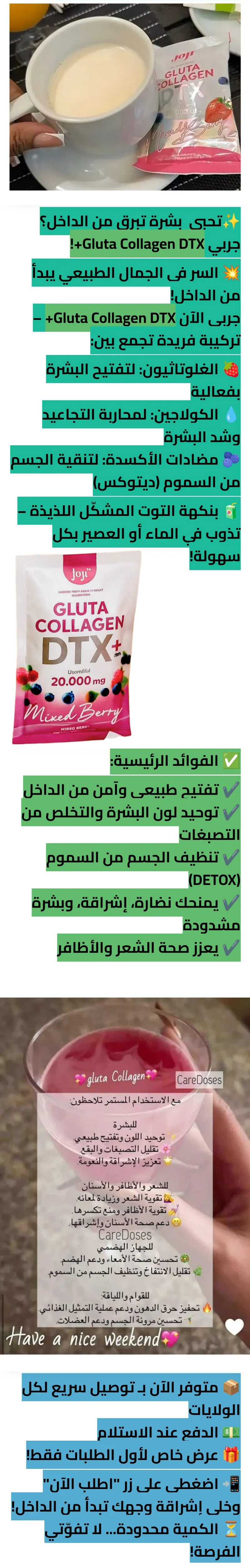 منتج Gluta Collagen DTX يُسوَّق كمكمل جمالي وصحي، حيث يجمع بين الكولاجين و الجلوتاثيون مع مضادات أكسدة وألياف طبيعية. يساعد على: ✨ تفتيح البشرة وتوحيد لونها ✨ تحسين مرونة الجلد ونضارته ✨ مكافحة التجاعيد والشيخوخة المبكرة ✨ دعم إزالة السموم من الجسم والهضم ✨ تقوية الشعر والأظافر بفضل العناصر المغذية