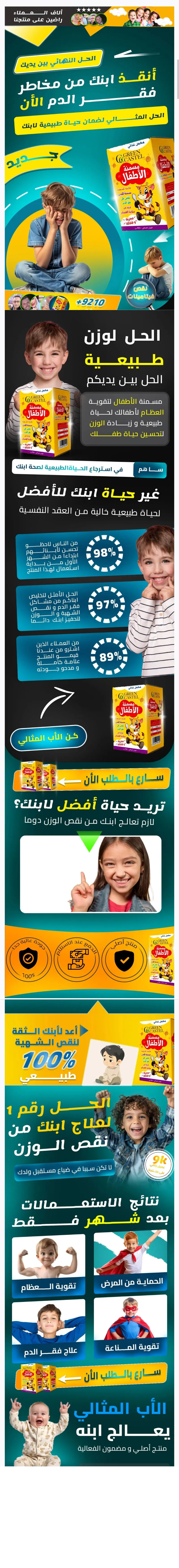 مسمنة الأطفال Green Castle مكمل غذائي طبيعي مخصص لدعم زيادة الوزن بشكل صحي للأطفال، يحتوي على مكونات طبيعية تساعد على فتح الشهية، تحسين الهضم، وتقوية الجسم بالفيتامينات والمعادن الضرورية للنمو السليم.